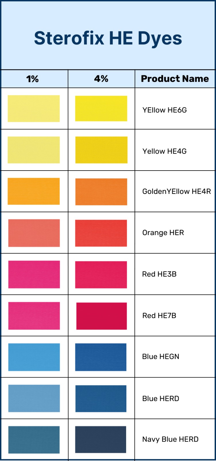 Sterofix HE Dyes are advanced bis-monochlorotriazine reactive dyes engineered for high exhaustion and fixation, ideal for exhaust dyeing processes conducted at 80–85°C. With broad versatility, they perform exceptionally well on yarns, fabrics, loose stock, garments, and blends—delivering vibrant, consistent shades even on challenging substrates. Their robust chemical structure ensures reliability in both productivity and cost-efficiency.