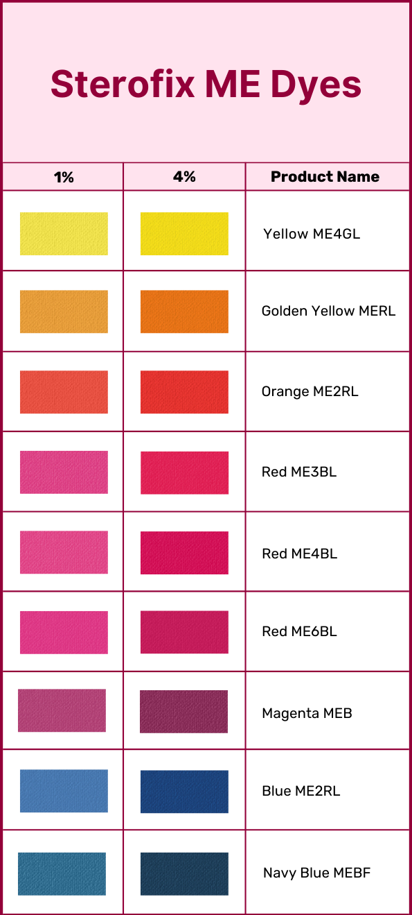Sterofix ME Dyes are high-performance bifunctional reactive dyes, purpose-built for exhaust dyeing at 60°C. With excellent exhaustion and fixation capabilities, they ensure cost-effective and reliable coloration for a wide range of textile applications. Designed for compatibility with vinyl sulfone dyes, Sterofix ME Dyes deliver consistent, reproducible results with deep shade build-up and strong all-round fastness.
